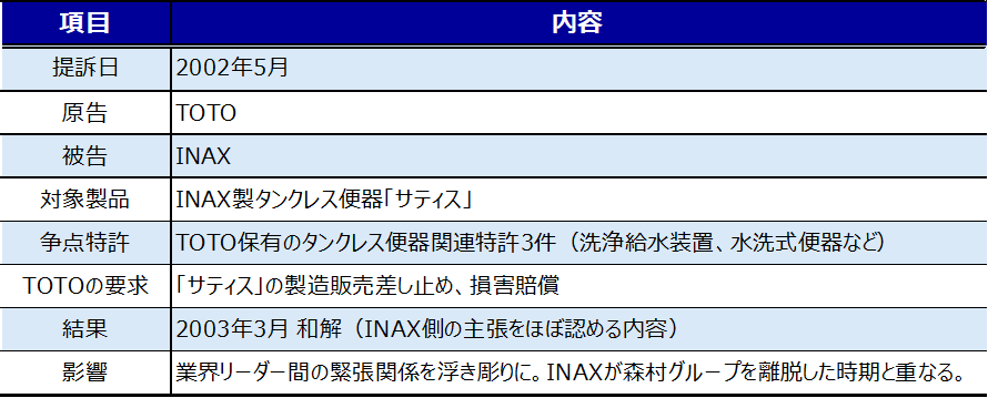 「特許戦争」と聞くと、法廷での派手な訴訟合戦をイメージするかもしれません。実際に、TOTOとINAXの間でも、2002年にはTOTOがINAXのタンクレス便器に対して特許侵害訴訟を起こした事例があります。この訴訟は、INAXの主力製品「サティス」の製造販売差し止めと損害賠償を求めるもので、約10ヶ月に及びましたが、最終的には裁判所の和解勧告により、INAX側の主張をほぼ認める形で決着しました。