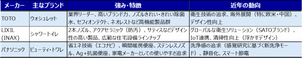 現在の市場は、TOTOとLIXILの二強に加え、パナソニックも「ビューティ・トワレ」ブランドで独自の地位を築いています。パナソニックは、家電メーカーとしての強みを活かし、省エネ技術や「瞬間暖房便座」、汚れにくいステンレスノズルなどで差別化を図っています。