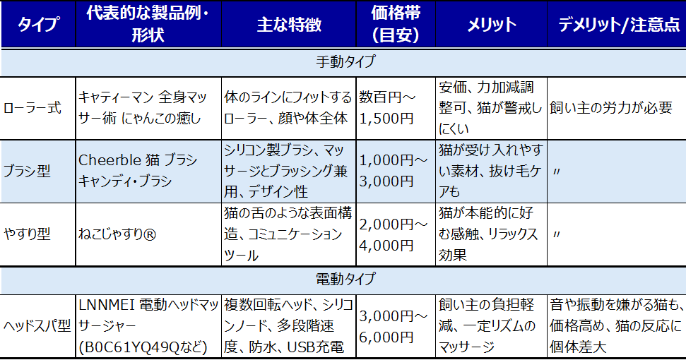 表2: 市場の猫用マッサージ機のタイプ別特徴まとめ
